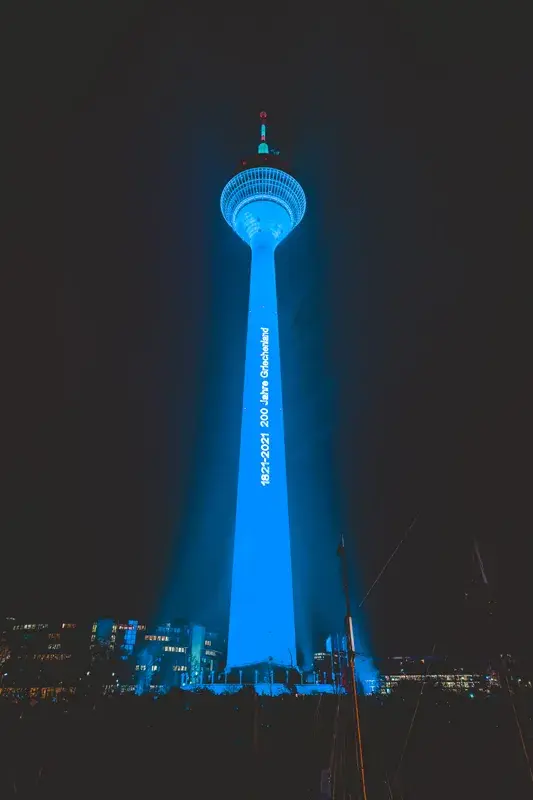 Düsseldorf is one of the important cities that participated in the celebration. The Rheinturm (Rhine tower) with a height of 240,5m. is the trademark of the city and its tallest building. For the glorious anniversary of the two centuries from the Greek revolution, a spectacular lighting was organized in collaboration with the Consul General of Greece in Düsseldorf, Mrs. Maria Papakonstantinou and the mayor of the city, Mr. Stefan Keller, and the kind sponsorship of ELVIAL.