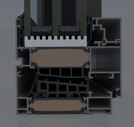 Wide insulating bars with 25% glass fibre reinforcement of 54mm, are applied to all system profiles, offering high thermal insulation levels and extra rigidity. -