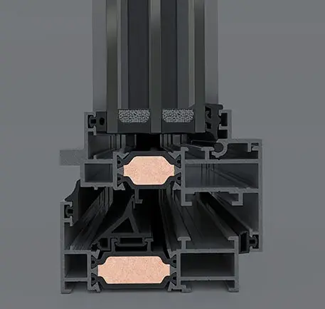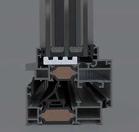 Wide insulating bars with 25% glass fibre reinforcement of 32mm, are applied to all system profiles, offering high thermal insulation levels and extra rigidity. -